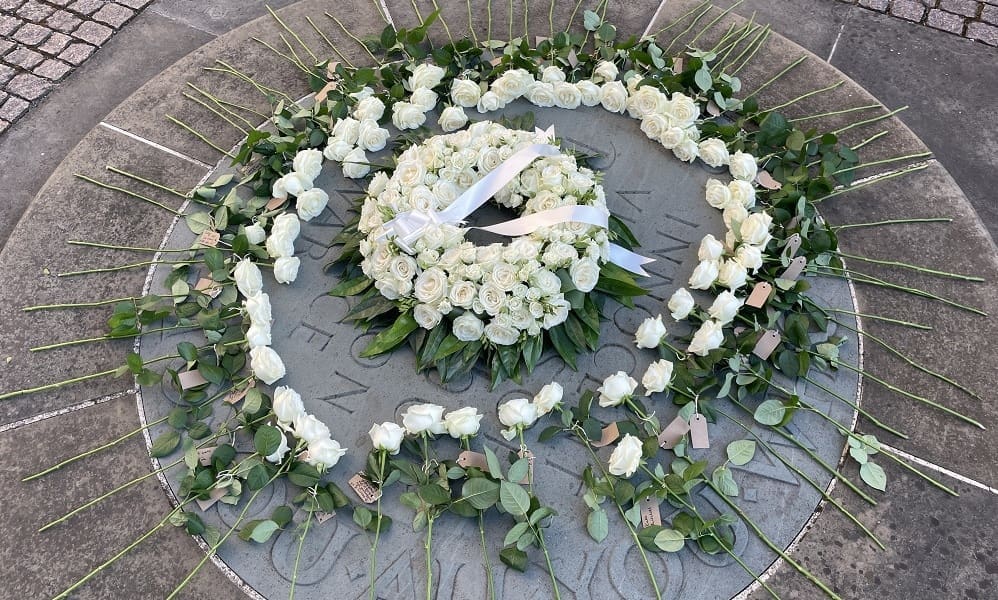 White roses laid yesterday at Westminster Abbey, UK, in memory of fallen aid workers.
