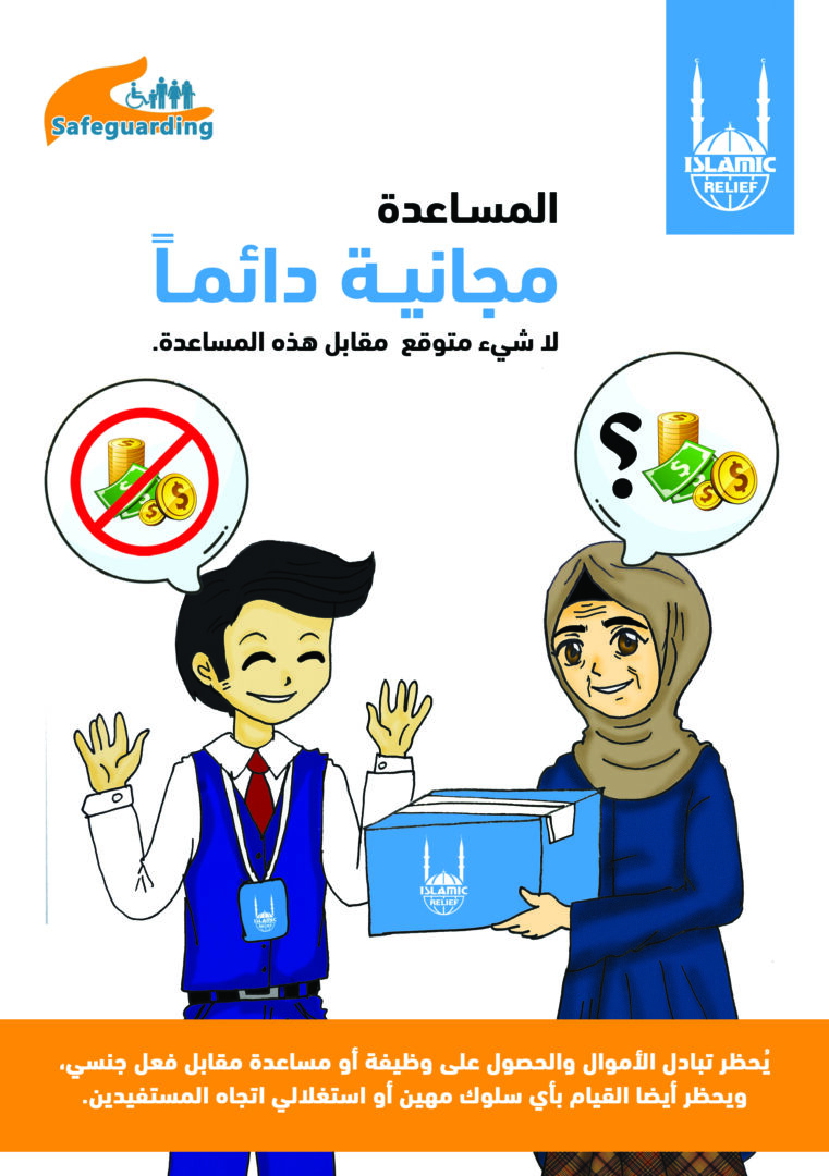 Islamic Relief created materials in local languages to communicate key concepts, like the image above which explains that aid is free