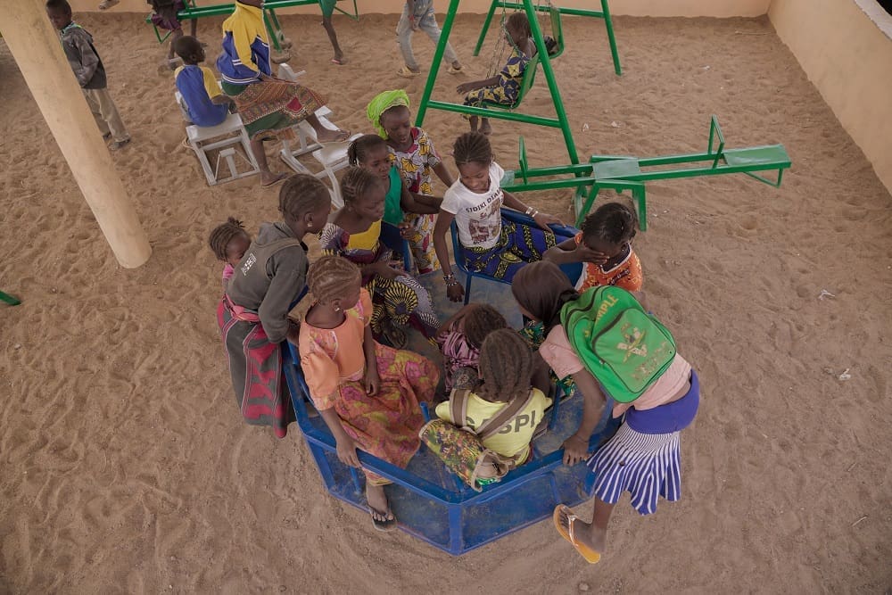 A new, covered school playground boasts swings, a slide and a merry-go-round. And, of course, lots of whooping and laughing children.