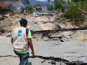 An Islamic Relief worker surveys a road in Balaroa damaged by the disaster in 2018.