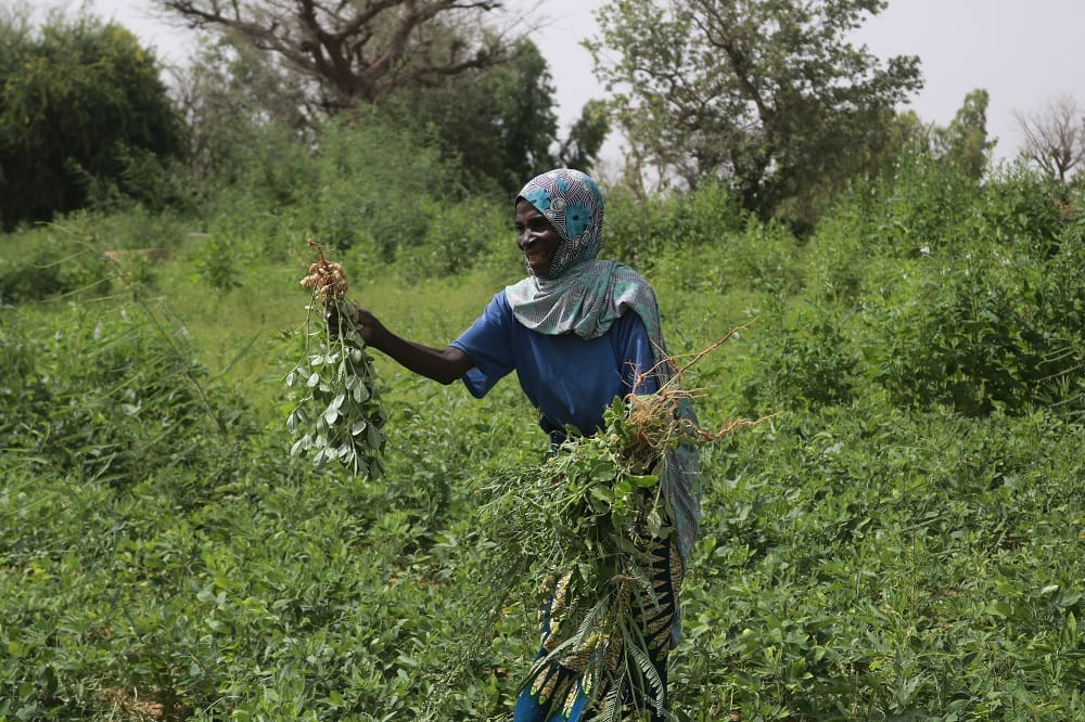 In Niger, a woman harvests peanuts grown on reclaimed land with the help of Islamic Relief. The project brings local people together in local cooperatives and supports them to establish climate-resilient livelihoods.