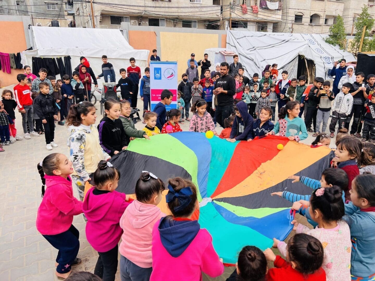 Editor’s note: This blog was submitted amid a fast-changing and deepening crisis. The information was correct as of Monday 29 January 2024. Image shows children in a shelter in Gaza taking part in games to improve their wellbeing during the crisis.